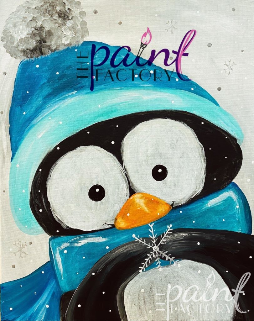 Join us Sun Jan 11th at 2pm for the return of “Bundle Up”…we will walk you step by step through this adorable penguin and will even have him sketched on the canvas for you. Better yet, it is Family Day so All Ages Are Welcome and Cost is only $30/painter. We hope to see you there!