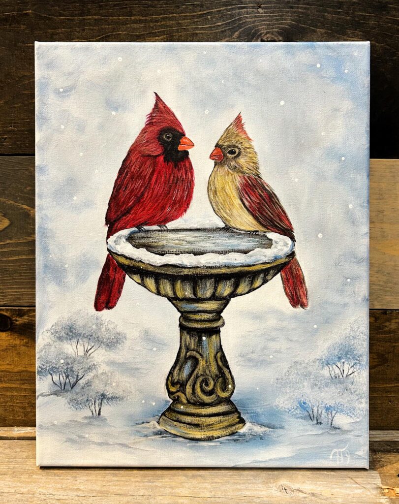 Join us Sat Jan 24th at 10am for the debut of “Cardinal Bath”…We will walk you step by step through this brand new cardinal painting…no experience necessary. And better yet we will have the cardinals and the bird bath sketched on there for you.