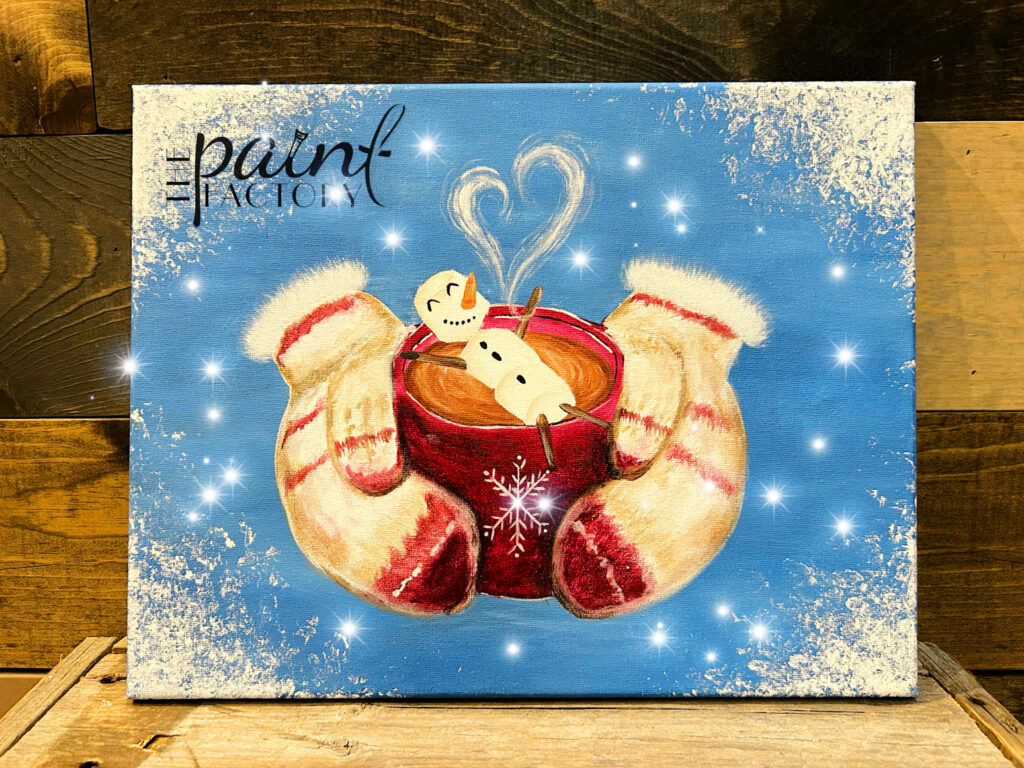 Join us Sunday Dec 14th at 2pm for the debut of “Cup of Cocoa” on an 11″x14″ Canvas…We will walk you step by step through this cute painting and better yet your mug, mittens, and marshmallow man will be sketched on there for you! Feel free to change up the colors as you like. It is Family Day so All Ages Are Welcome and Cost is Only $30/painter.