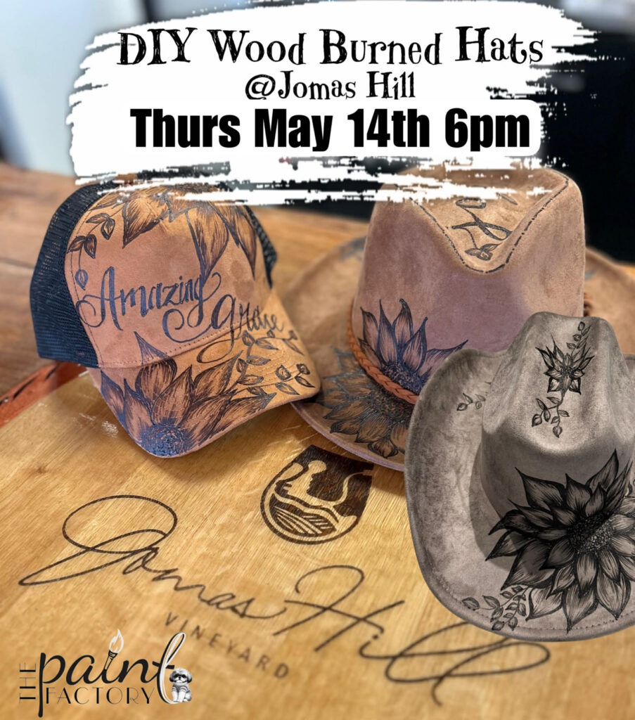 We are so excited to bring our first ever hat burning class ON THE ROAD…and even more excited that this event will take place at Jomas Hill. Join us Thursday May 14th at 6pm at Jomas Hill Winery which is located at 67755 205th St Darwin, MN! Choose from 3 different hat styles and create your own custom hat. Cost of the evening includes your chosen hat style (Mesh Trucker, Fedora, or Cowboy) supplies to wood burn your design, and the choice of adding your own bling at the end with accessories for your hat! Feel free to arrive early at 5pm to order food and beverage…at 6pm Tara will demonstrate how to wood burn your own hat and then you have until 8pm to complete your project. Various Stencils will be available for you to trace (including floral, word, cow, and other designs for you to choose from…but feel free to bring your own stencil as well…3″ -4″ stencils will work best). Upon completion, upgrade your hat design by adding accessories for an additional charge. Or feel free to bring your own items you would like to add to your hat!