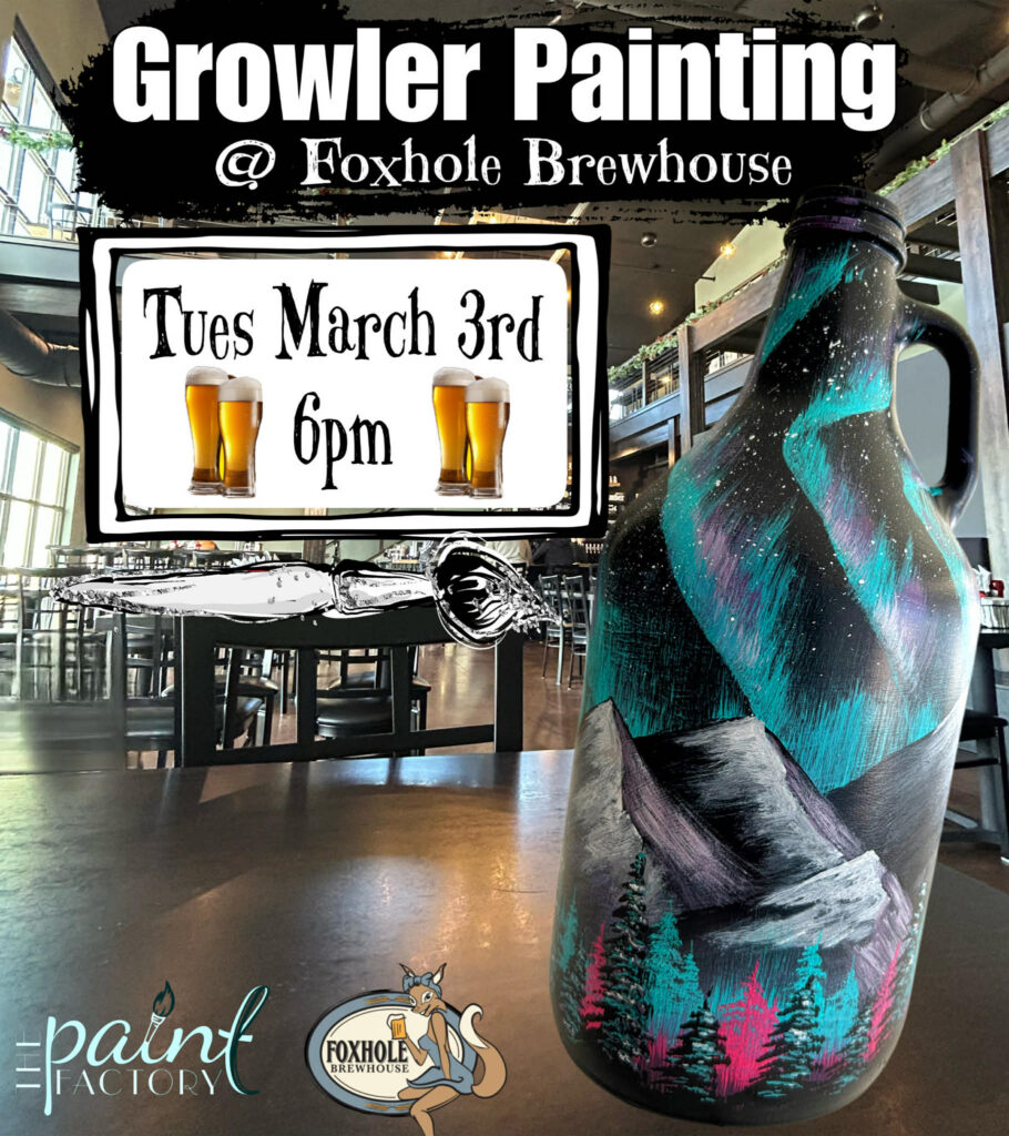 Growler Painting is back…and We are soooooo excited to be heading to Foxhole Brewhouse, in Willmar MN! Cost of the evening is $45/each and includes 1 Primed Growler and materials needed to paint “Northern Lights Mountain” on your growler. Painting will start at 6pm but feel free to come early to order beer/beverages/food. Check out their full beer and food menu at https://www.foxholebrewhouse.com/. This will be an awesome night of painting in private room at Foxhole Brewhouse located at 905 Highway 71 NE, Willmar, MN. SPOTS ARE LIMITED so register soon! ***NO FREE CLASS CARDS…No Refunds or changing of dates due to materials being ordered***…Don’t miss out!