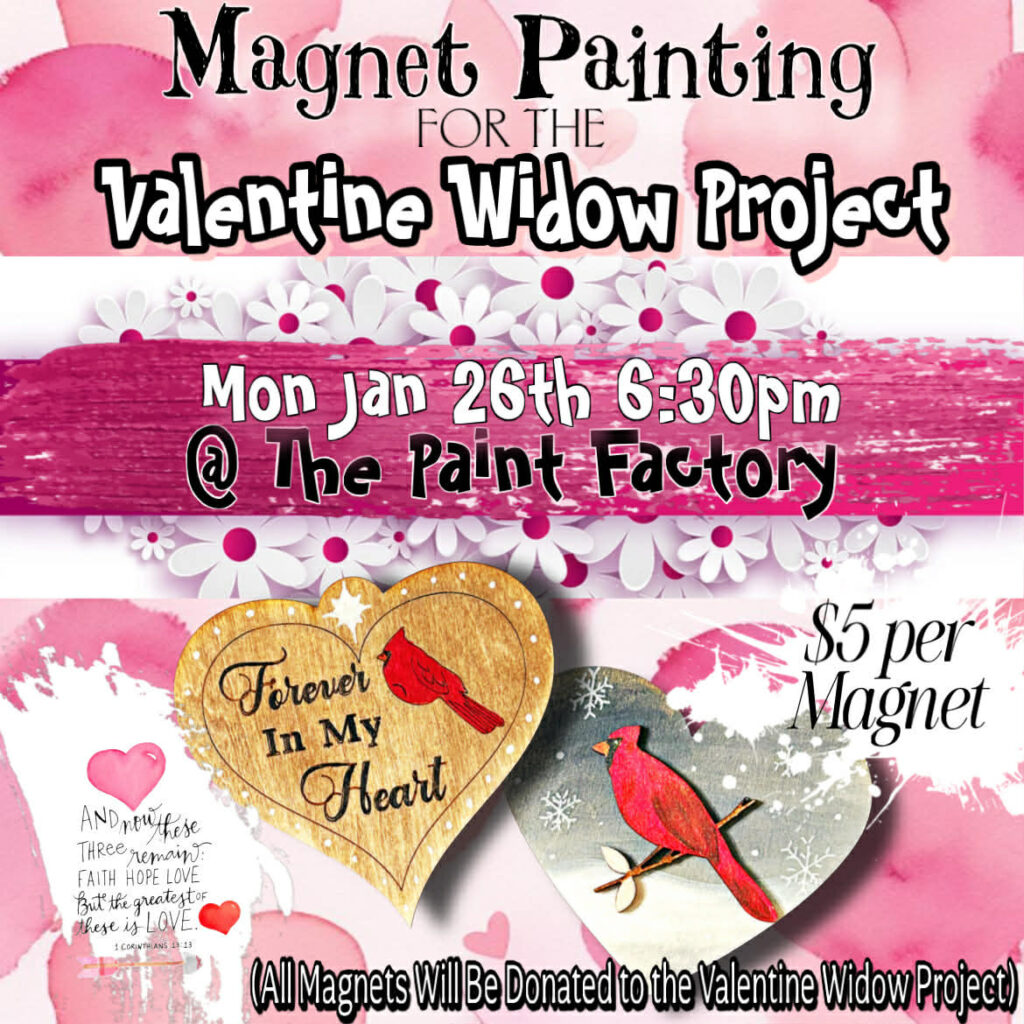 We are excited to be teaming up with The Valentine Widow Project for the 4th year in a row but this time we wanted to get our community involved…So we’re hosting a Valentine Widow Outreach on Mon Jan 26th at 6:30pm where we’ll be painting magnets together to donate to the Valentine Widow Project. Once painted, these handmade magnets will be donated to widows/widowers as a small reminder that they are seen, loved, and remembered this Valentine’s season. The $5 registration fee covers your first magnet (but we will have additional magnets available the night of the event at $5/each…paint as many as you like…we have a goal of painting 300 magnets this evening which will all be donated so we hope you can join us!).