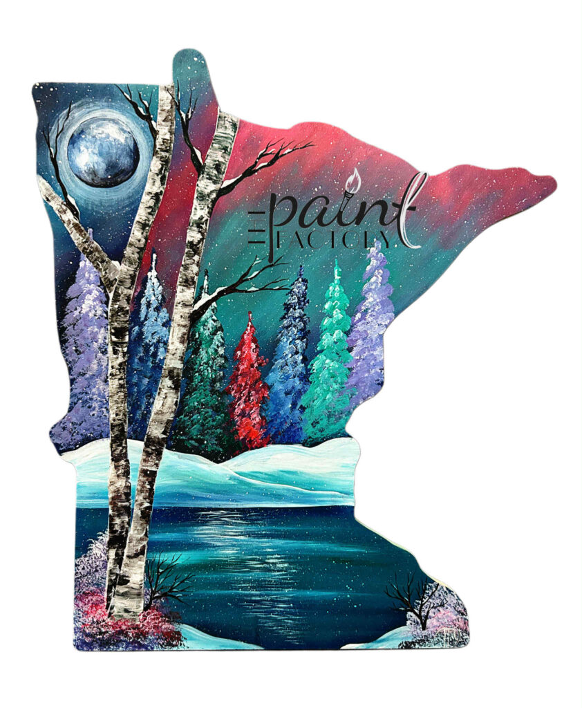 Join us Sat Dec 13th at 10am for the debut of “Aurora MN” on our brand new Wood MN Cutout. We will walk you step by step through this painting…no experience necessary. And each painter will paint on their very own wood MN cutout measuring approximately 15″ x 17″. Feel free to change up the colors however you like. ***NO FREE CLASS CARDS…No changing of dates due to materials being prepped in advance***