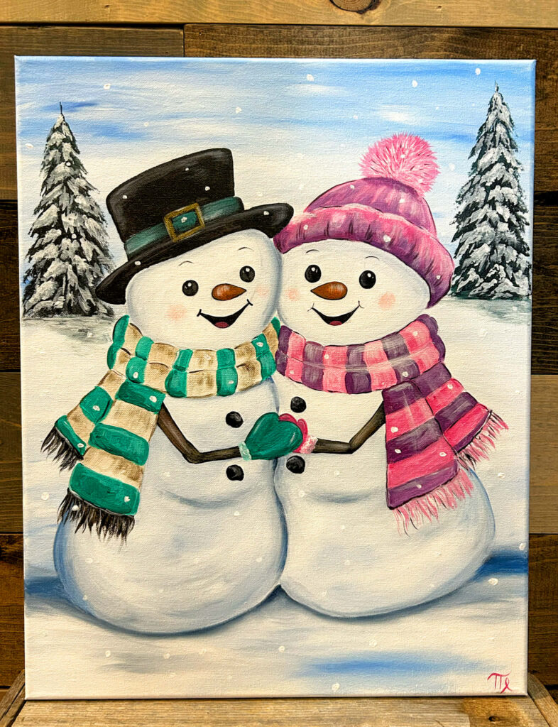 Join us Sat Feb 14th at 10am for the debut of “Snow in Love”…We will walk you step by step through this adorable new snowman couple painting…And better yet we will have the snowmen sketched on your canvas for you. Start your Valentines (Or Gal-entines) Day off on the right foot and paint with us!